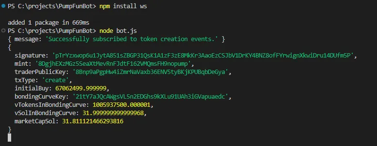 Now we can call sendPumpTransaction() in the Websocket message callback to buy 0.01 SOL of a token right after it’s created.