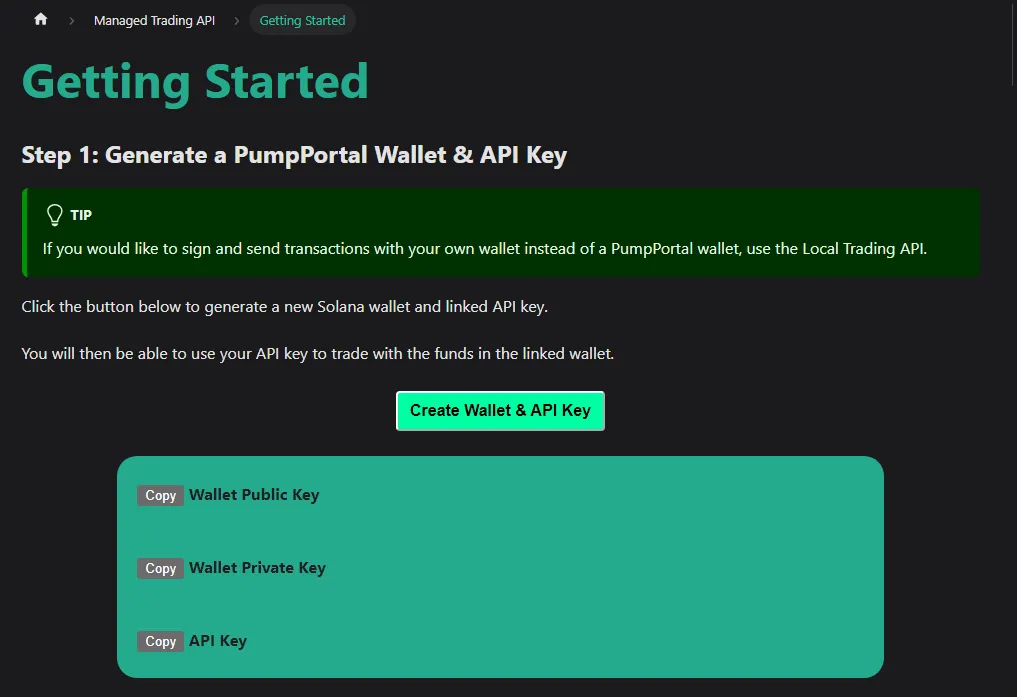 Before getting started, we’ll need to create a PumpPortal wallet and API key, and fund the wallet with some SOL. (To use a self-custody wallet, use the Local Trading API — the only downside is you have to manage signing and sending transactions yourself.)